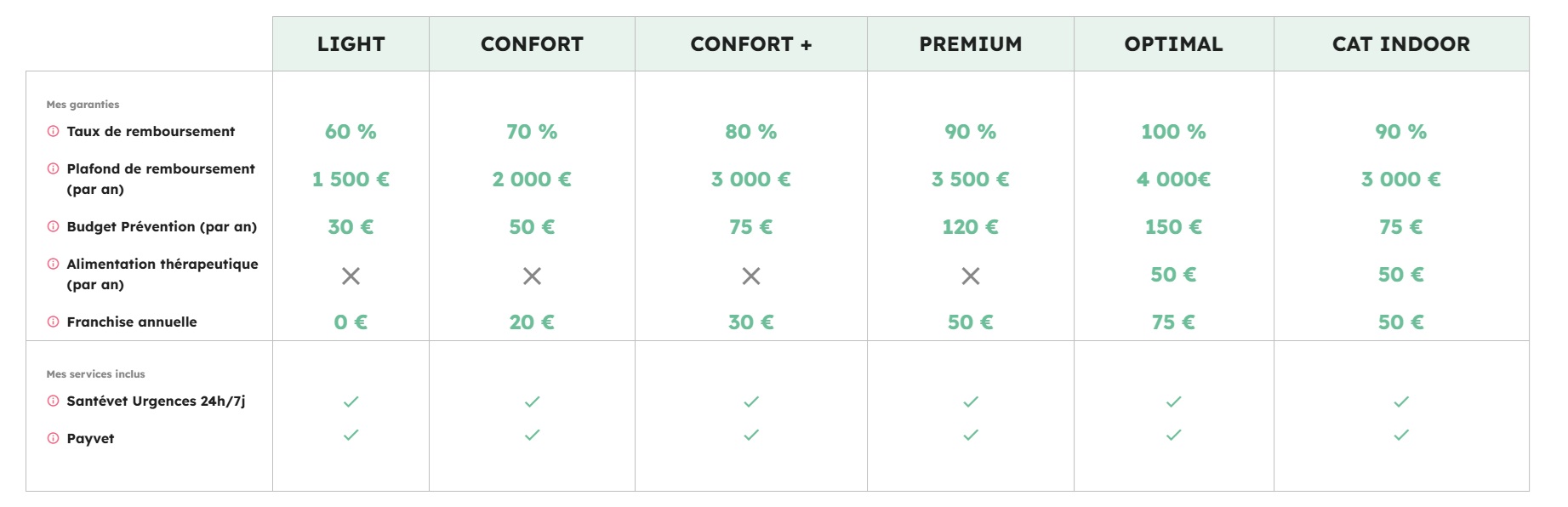 | ✅ Service Payvet pour éviter l’avance de frais | ❌ Augmentations tarifaires importantes avec l’âge de l’animal |